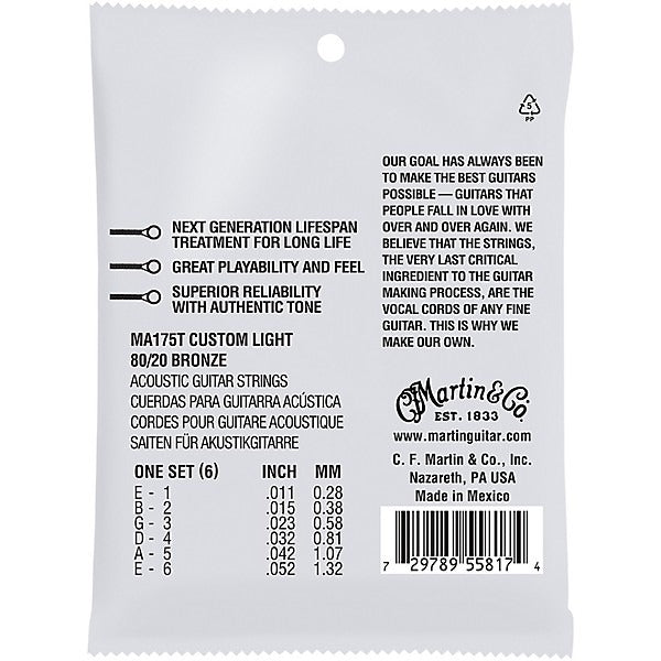 Next generation Martin® Authentic Acoustic® Lifespan® 2.0 strings are engineered using a patented anti-corrosion treatment only available from Martin. It protects the core and wrap wire to prevent corrosion without compromising tone or feel.