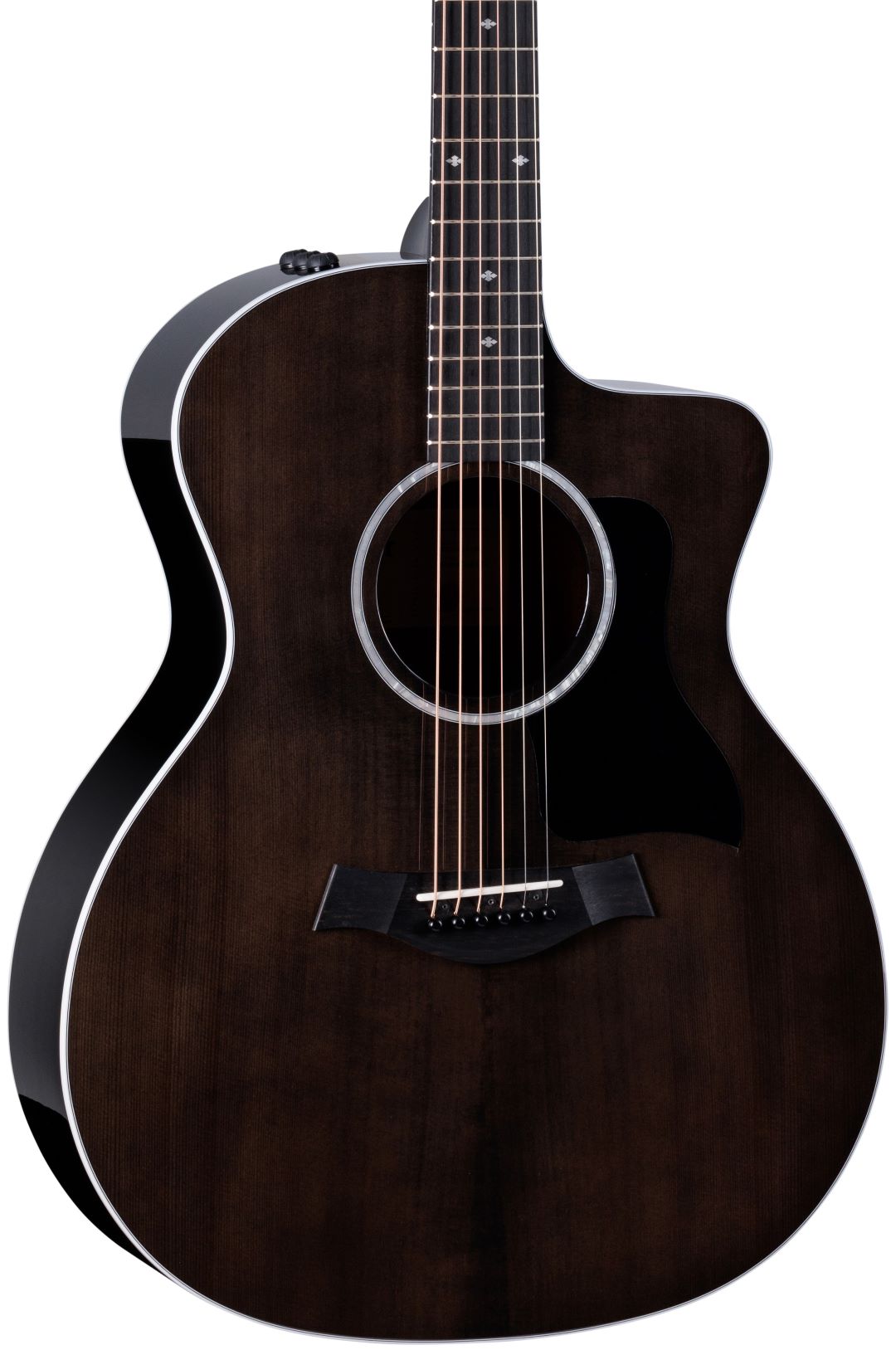 The top boasts a dark, transparent grey finish while a black finish wraps the back, sides and slim, easy-playing Taylor neck, which features an accomodating 1 11/16” nut width. Satin black tuners and a black pickguard create an appealing visual contrast with an Italian acrylic rosette, white peghead logo and white body binding. Small Diamond fretboard inlays add touches of contemporary elegance.