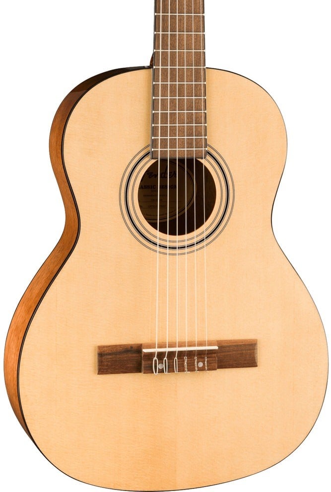 This short scale nylon guitar strikes an ideal balance between comfort and projection perfect for children, beginners or players with smaller hands seeking superior playability without sacrificing tone. The Spruce top provides bright, crisp articulation while the Okoume back and sides add resonant depth and harmonic texture. Each guitar features a walnut fingerboard and bridge that provides rich tonal transfer and improved sustain, complemented by normal tension Fender® nylon strings for the perfect balance of warmth and clarity from first chord to final note.
