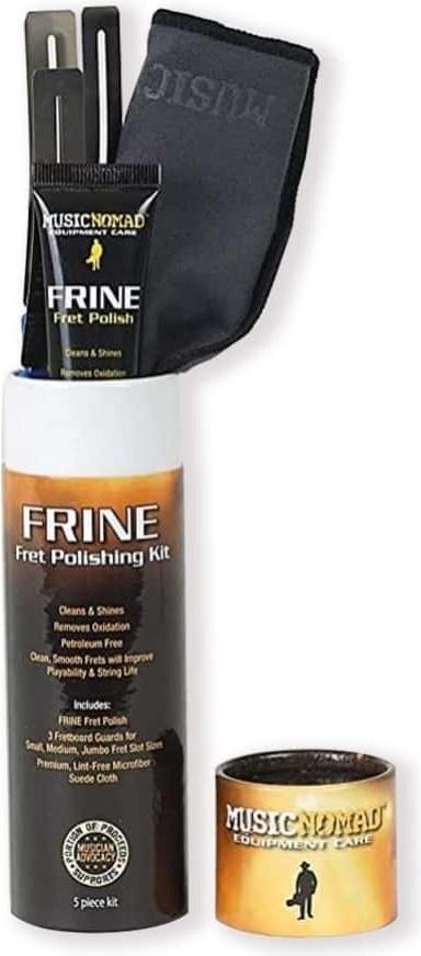 Music Nomad’s FRINE Fret Polishing Kit contains everything you need to give your frets an eye glaring, clean shine. The specially formulated FRINE Fret Polish has micro-fine polishing compounds that safely & quickly remove oxidation, dirt & oil. Their innovative fretboard guards and premium microfiber cloth are designed to make it safe and super easy. Now you can restore smoothness & a mirror shine to your frets without the hassle of harsh cleaners & messy steel wool. Look, Sound & Play the Best!