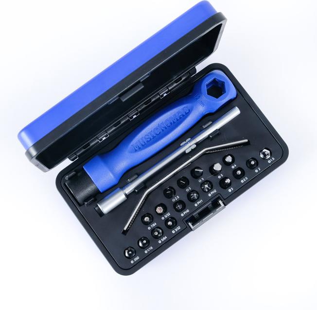 Includes Product Story A must have for every instrument case or work station. Music Nomad's Premium Guitar Tech Screwdriver and Wrench Set offers unmatched versatility in one compact, rugged case. Designed specifically for guitars it comes with 18 screwdriver bits, 7 hex wrench sizes, plus our Premium Spanner Wrench. Perfect for making adjustments on all your guitar hardware such as: tuners, jacks, pots, bridges, pickups, tailpieces, string guides, pickguards, tremolos and more. Our ergonomic, large handle is made from strong ballistic nylon material that wonβt scratch or ding your hardware and is engineered for the most popular hex wrench sizes. It can even tighten nuts in sunken pots and recessed jacks such as tele-cups. Thatβs Music Nomad quality β raising the bar in equipment care.
