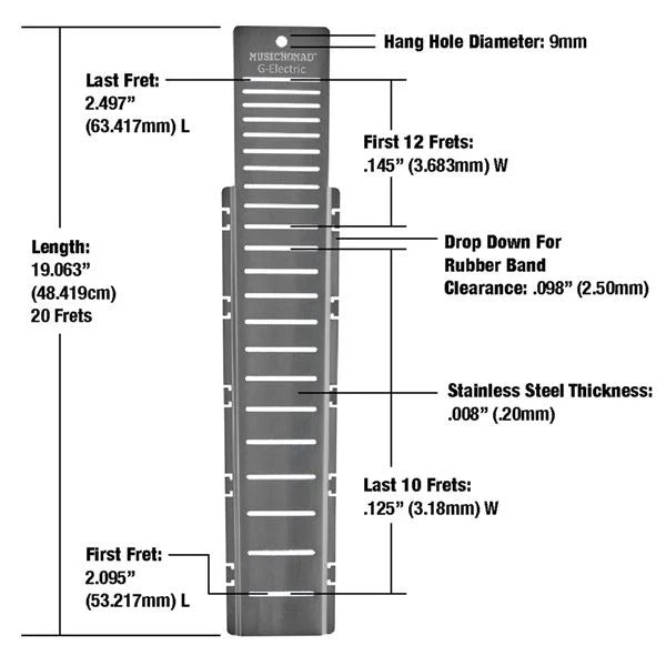 MusicNomad's Fret Shield is the ultimate solution for fret polishing that saves you time, money, and gives you peace of mind.Our patent-pending design revolutionizes fretboard protection with its reusable construction. Bid farewell to using blue tape and messy residue on your board. Our Fret Shield's durable stainless-steel build at .008" (.20mm) thickness is expertly manufactured, guaranteeing a smooth and rounded surface free of burrs. Additionally, our formed drop-down edges secure rubber bands underneath for a safe and damage-free polishing process. Our Fret Shield comes in popular Fret Scale sizes and even features a convenient hang hole.