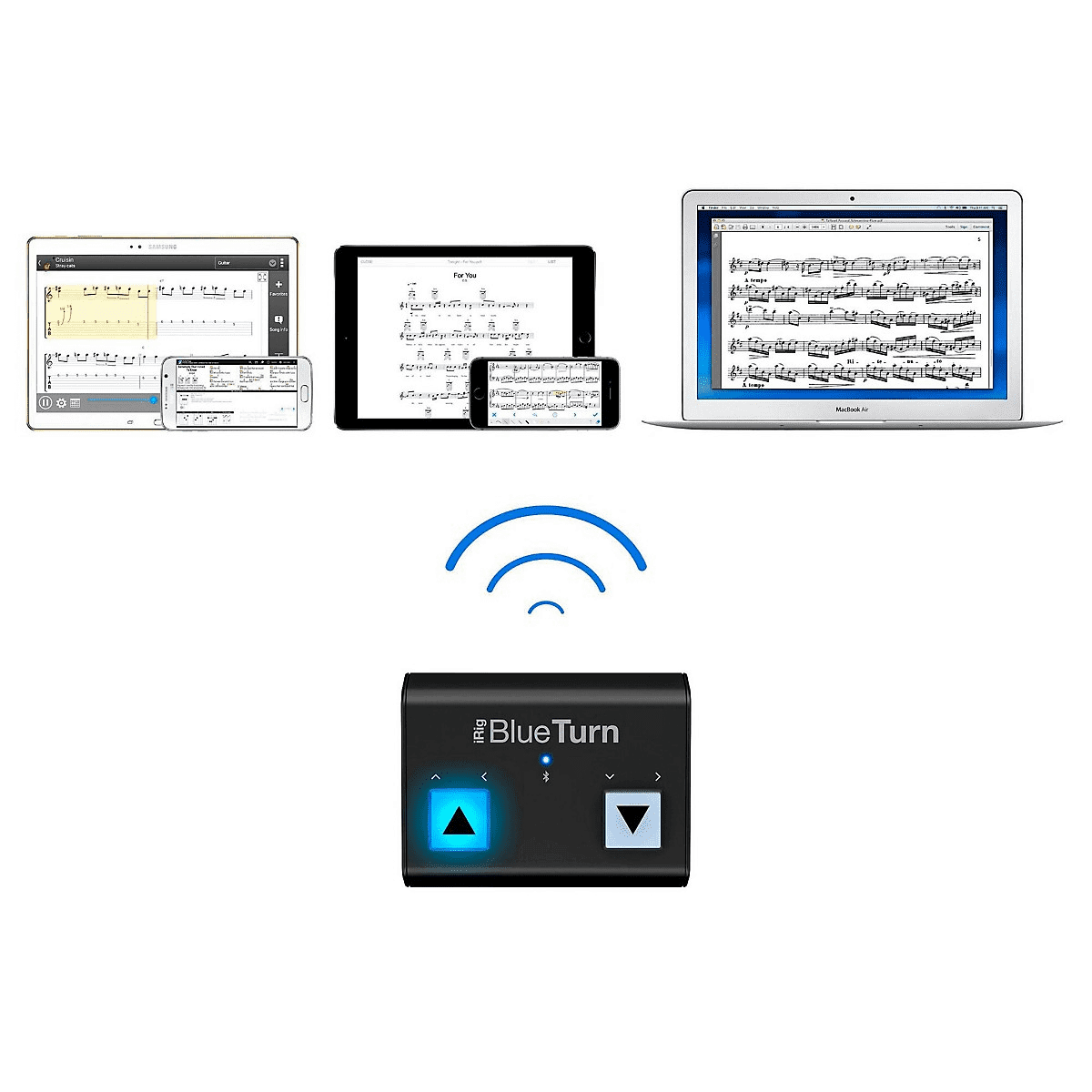 Now, with iRig BlueTurn, you'll be ready to perform at your best no matter whether you're conducting an orchestra, playing music from a score, shredding through some guitar or bass tabs, giving a major presentation, lecturing, or making a speech. With iRig BlueTurn, it's your turn.