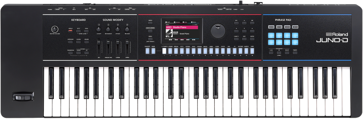 JUNO-D is the perfect synth for gigging musicians and budding creators. This light and portable keyboard features a pro-grade Roland sound engine and an intuitive panel layout for easy operation. Play in a band or craft new songs with a massive sound library, an eight-track sequencer, and versatile connections for your gear. Perform on the move with support for USB-C mobile battery power. And stay inspired with new sounds on Roland Cloud.