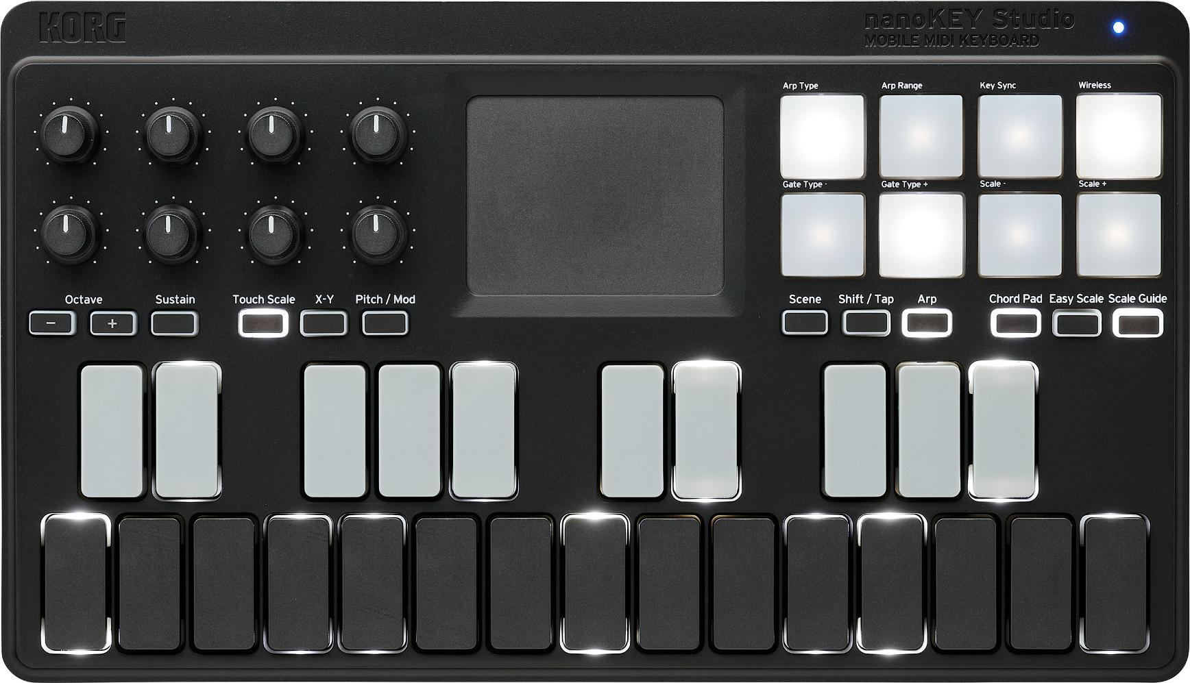 The nanoKEY Studio provides a keyboard, knobs, trigger pads, and touch pad that lets you instantly convert your inspiration into sound. It is battery operated and can connect wirelessly to iPhone/iPad or Mac/Windows. Itβs a compact, mobile MIDI keyboard that is easy to travel with, allowing ease of use anytime, anywhere.