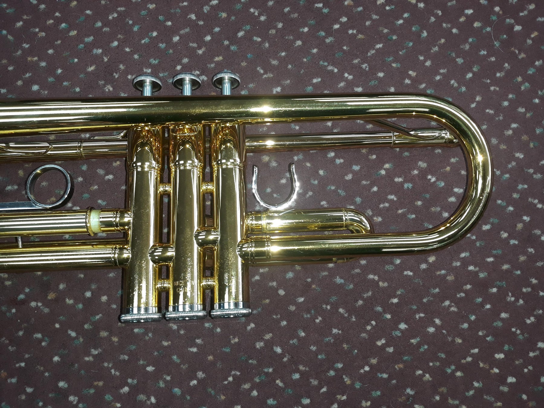 This particular instrument is a YTR-200ADII β€œAdvantage” trumpet with serial number 7648XX, manufactured in the early 1990s. Despite its age, it has been well maintained and remains in excellent playing condition. It does show some minor dings, pings, and light surface scratches from regular use. The second valve slide was dented and has since been professionally repaired.