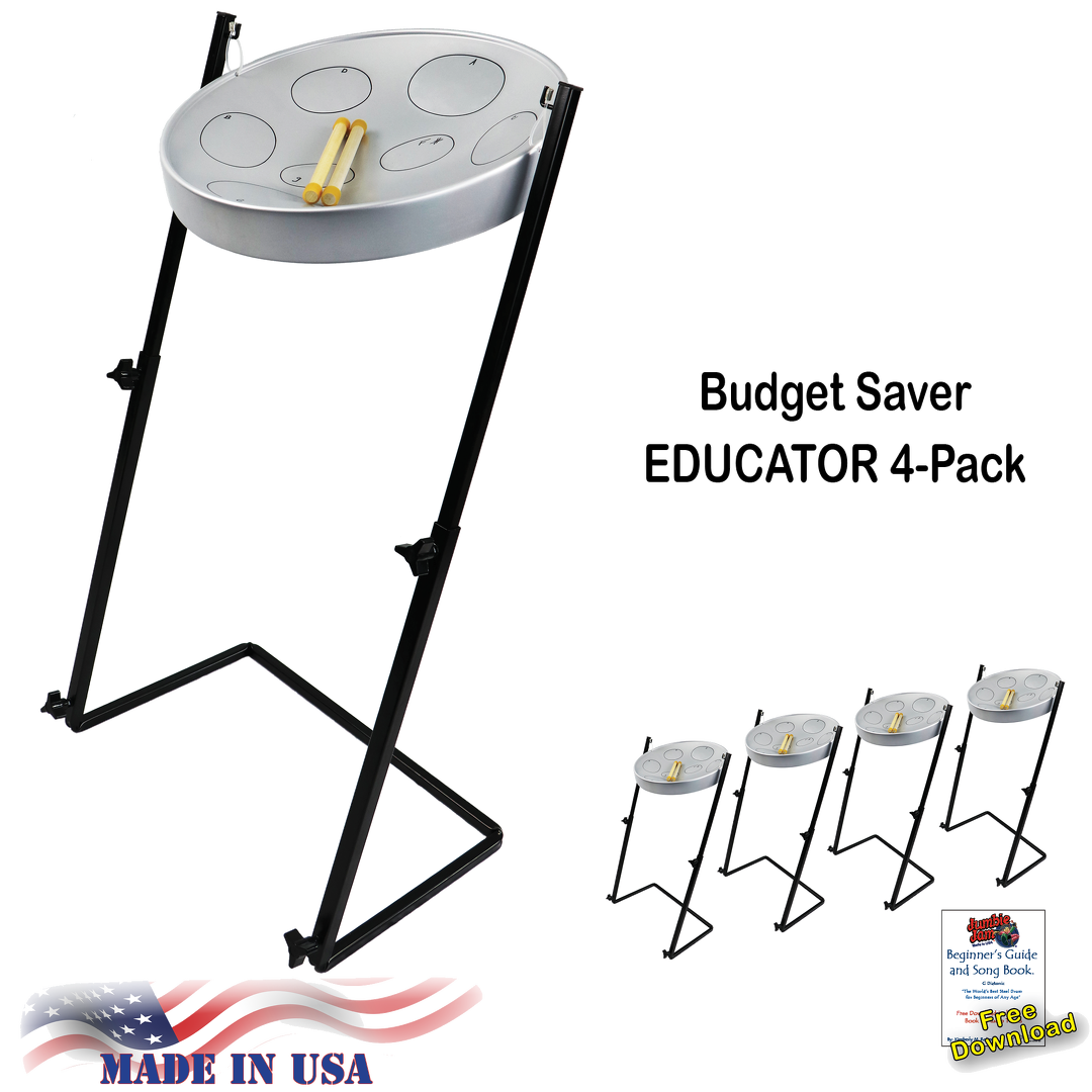 Jumbie Jam Steel Drum Educators 4-Pack - Metal Z-Floor Stands - Silver Pans (G)