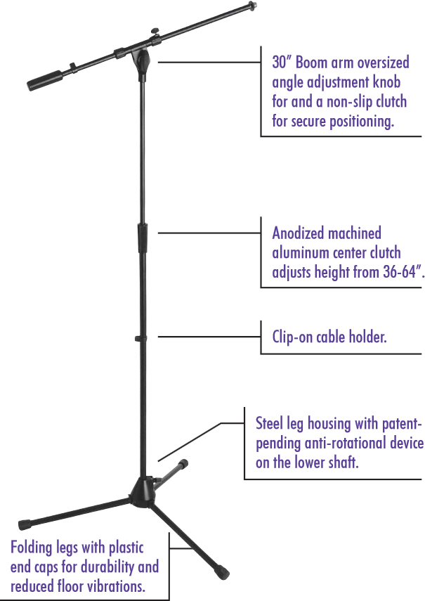 • Height adjustment provided by die-cast zinc clutch: 36"-64"