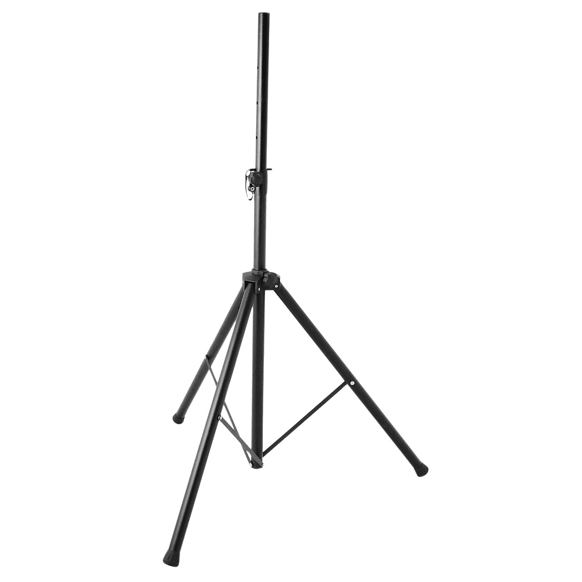 This all-steel speaker stand with 1 3/8" upper shaft comes with an 1 1/2" adapter, making it universal for all standard speaker cabinets. Features a 2-section vertical shaft with preset height adjustment holes and locking pin for added security. The tripod folding base folds flat and non-slip rubber end caps add stability.