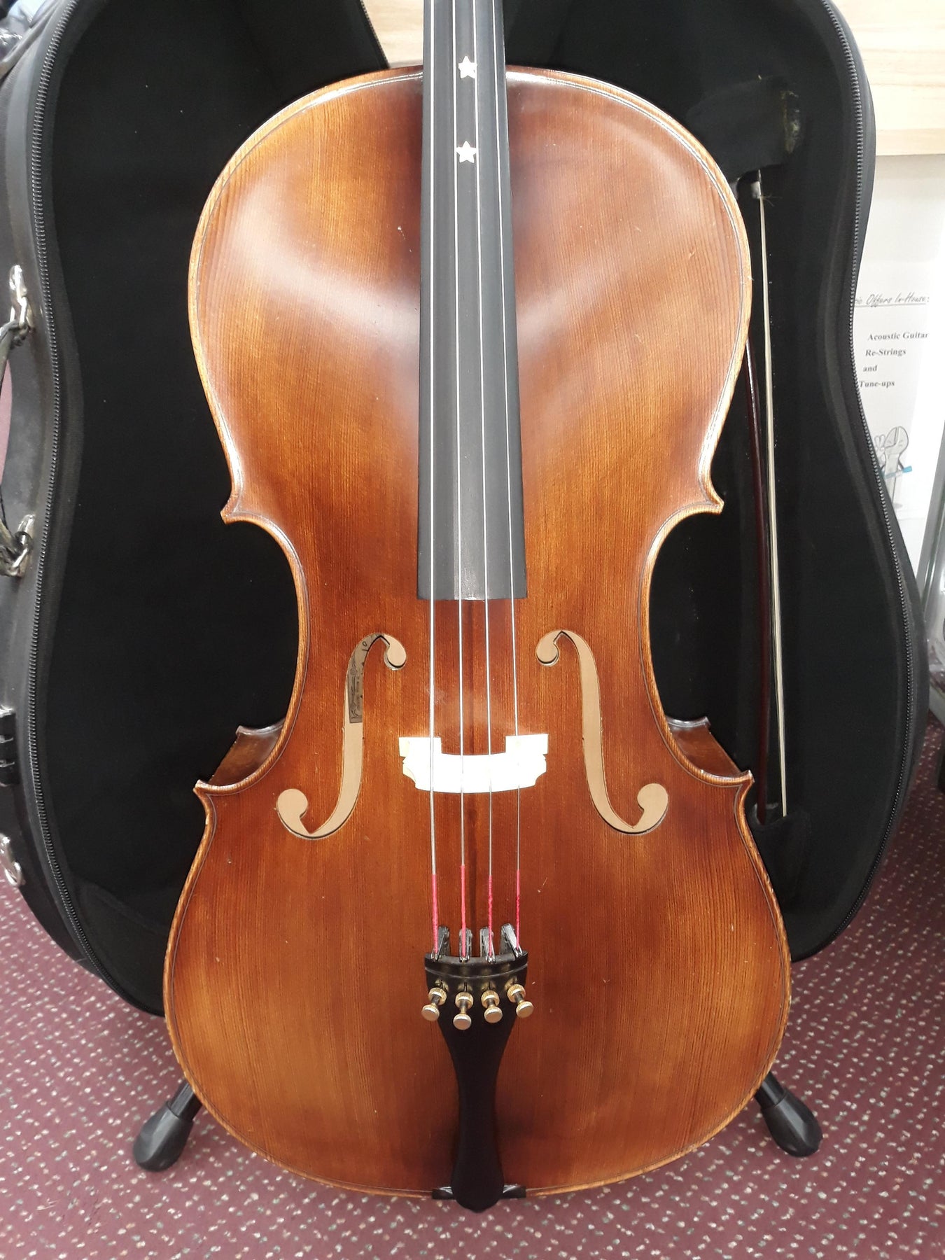 Originally purchased around 15 years ago, this cello has seen regular use and exhibits some signs of wear including dings around the rims, surface scratches, and stars placed on the fingerboard by a previous instructor to aid with note positioning. Despite cosmetic blemishes, there are no cracks or structural concerns. The instrument has been cleaned and adjusted by our in-house technician and is in general playing condition.